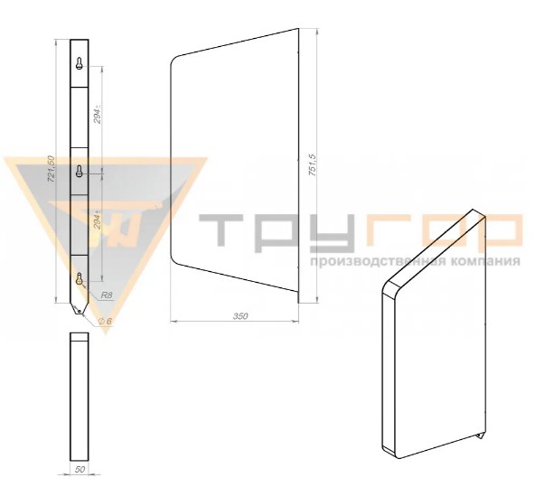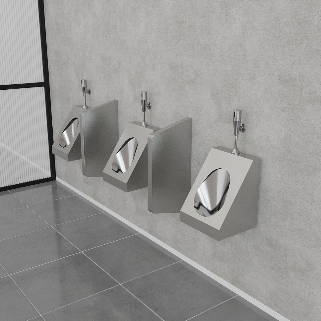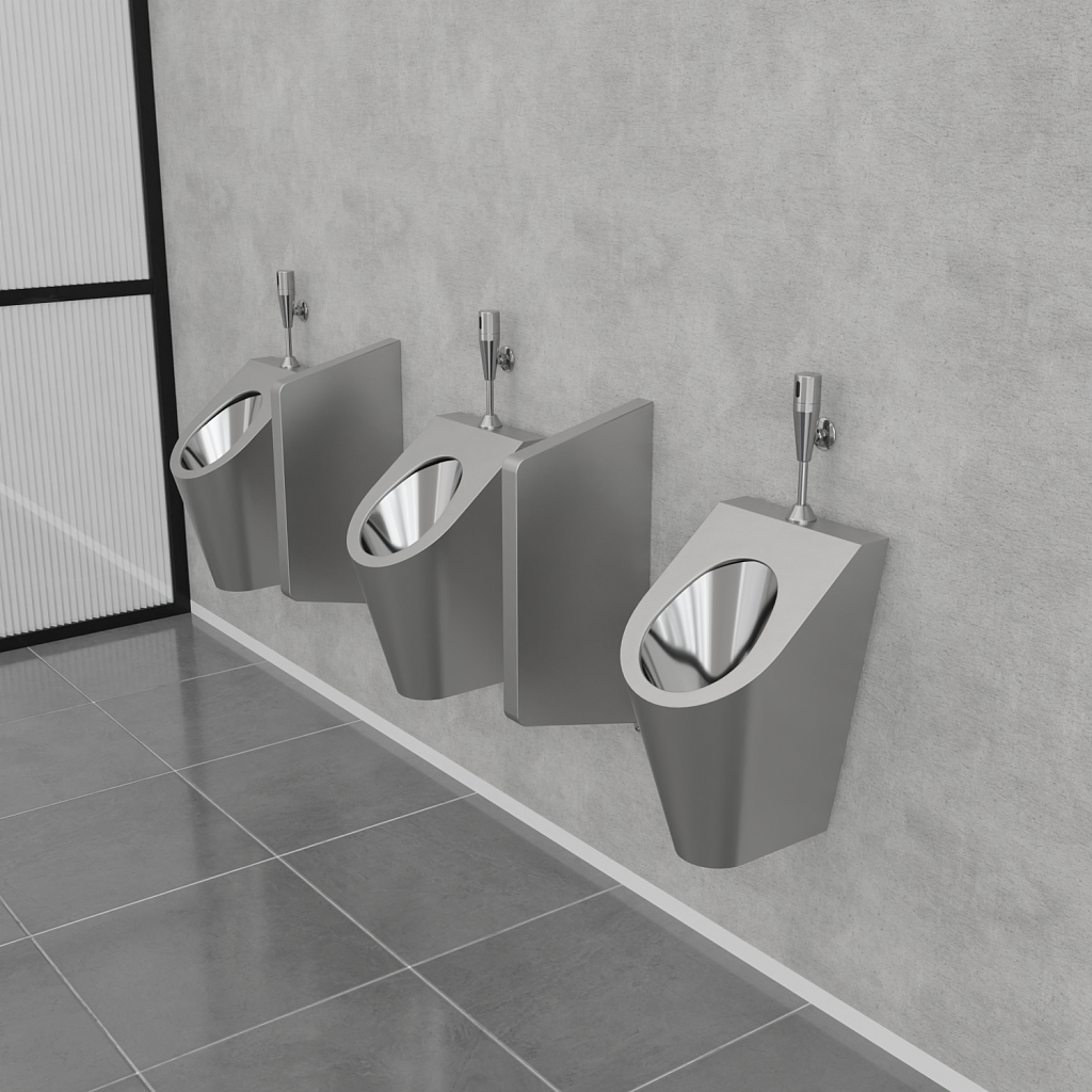 Межписсуарная перегородка от компании "Тругор" изготовлена из нержавеющей стали AISI 430 толщиной 1,2 мм. Поверхность металла матовая, имеет равномерный серый цвет, т.к. обработана пескоструйным методом.